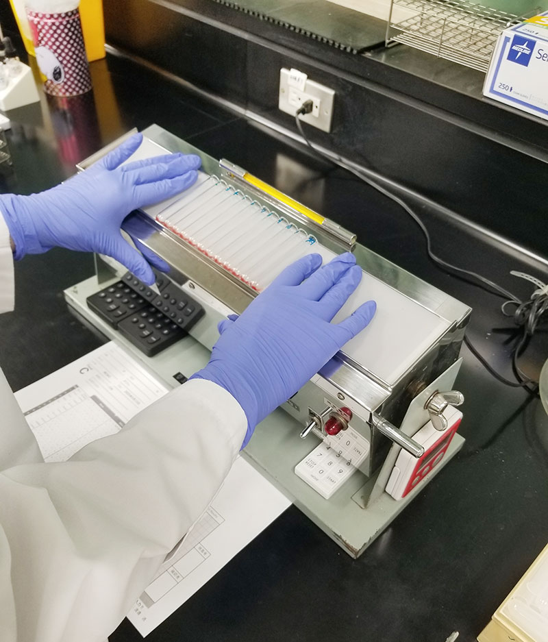 赤外分光分析装置POConeを用いてヘリコバクターピロリ感染診断法の一つである、尿素呼気試験を行っています。輸血分野では不規則抗体検査(同定)等を測定しています。